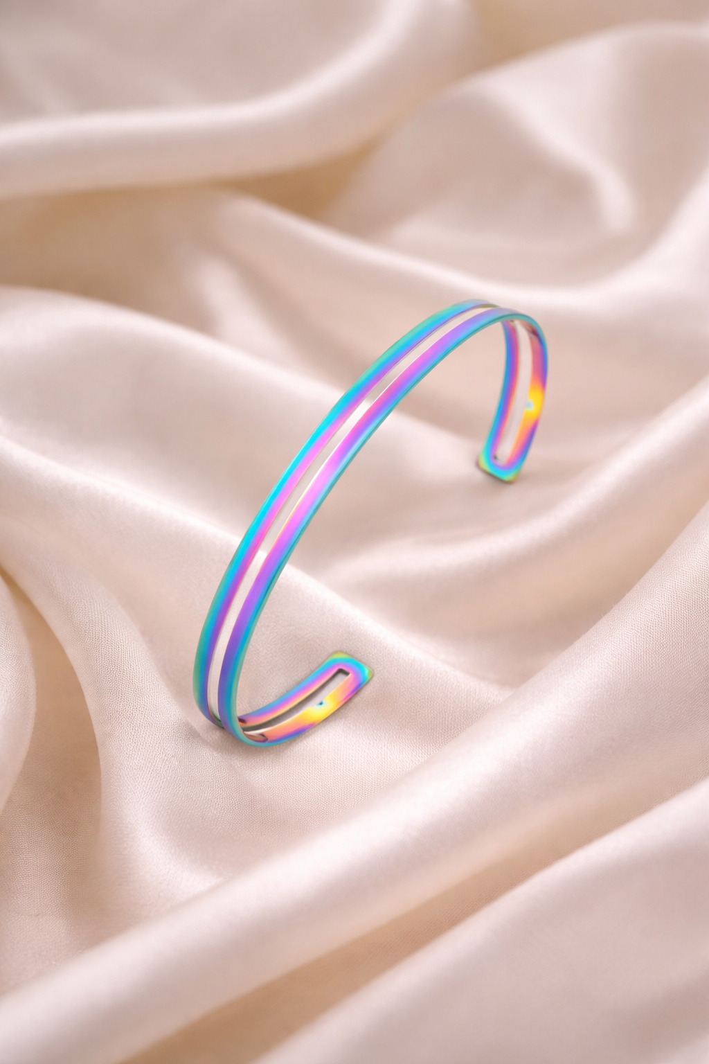 Moderna, luminosa e cheia de personalidade. Esta pulseira bracelete iridescente é uma peça contemporânea que transforma luz em cor. Seu acabamento metálico com efeito arco-íris cria reflexos únicos que mudam conforme o movimento, revelando tons vibrantes de azul, rosa, lilás e dourado. Com design minimalista e estrutura aberta, ela combina elegância moderna com atitude, tornando-se o destaque perfeito para qualquer look — do casual sofisticado aos momentos especiais. Uma joia para quem gosta de expressar estilo, criatividade e autenticidade.